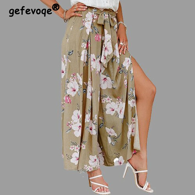 2022 летние модные леопардовые полосатые пикантные брюки с высокой талией и цветочным принтом, со шнуровкой, широкие брюки палаццо, Женские п...