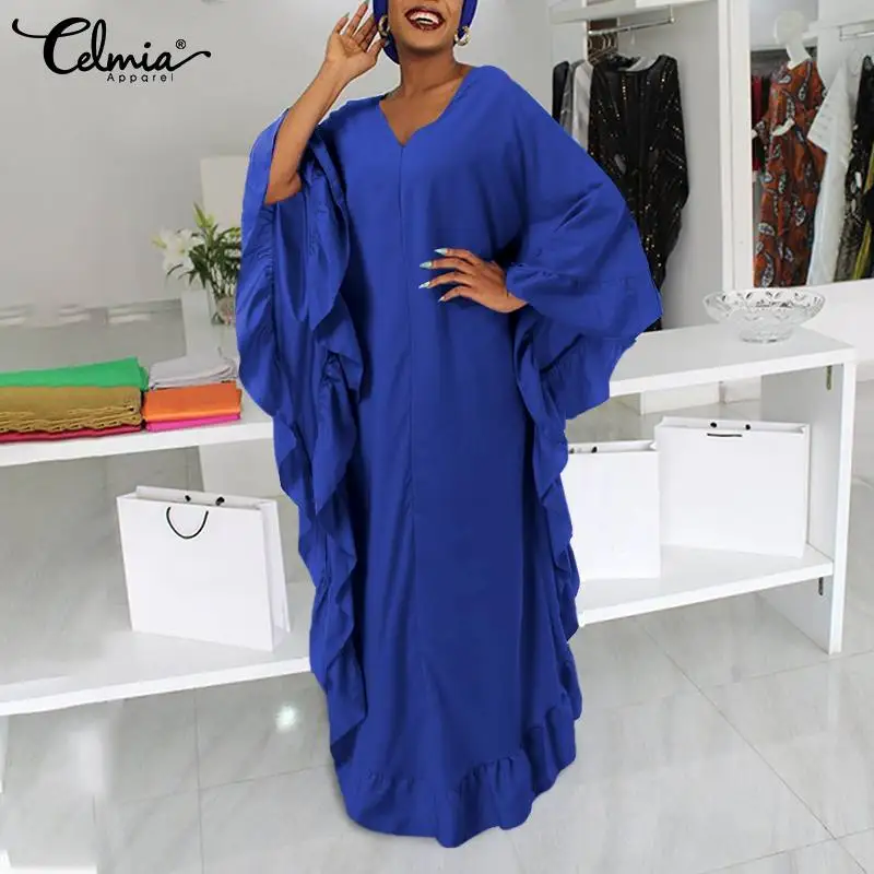 2022 модное женское платье макси Celmia стильное платье с рукавом летучая мышь с оборками и складками Вечерние Платья повседневные свободные дл...