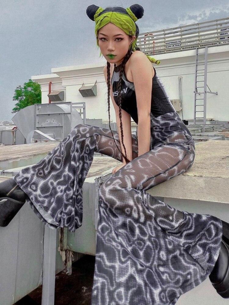 2022 модные сетчатые прозрачные сексуальные брюки с высокой талией, шикарные уличные брюки с принтом, сетчатые прозрачные брюки в стиле готический панк M