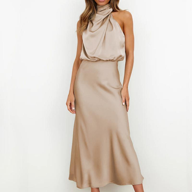 2023 Весна и лето Новое высококачественное атласное платье без рукавов Европейская и американская мода Элегантное женское легкое вечернее платье