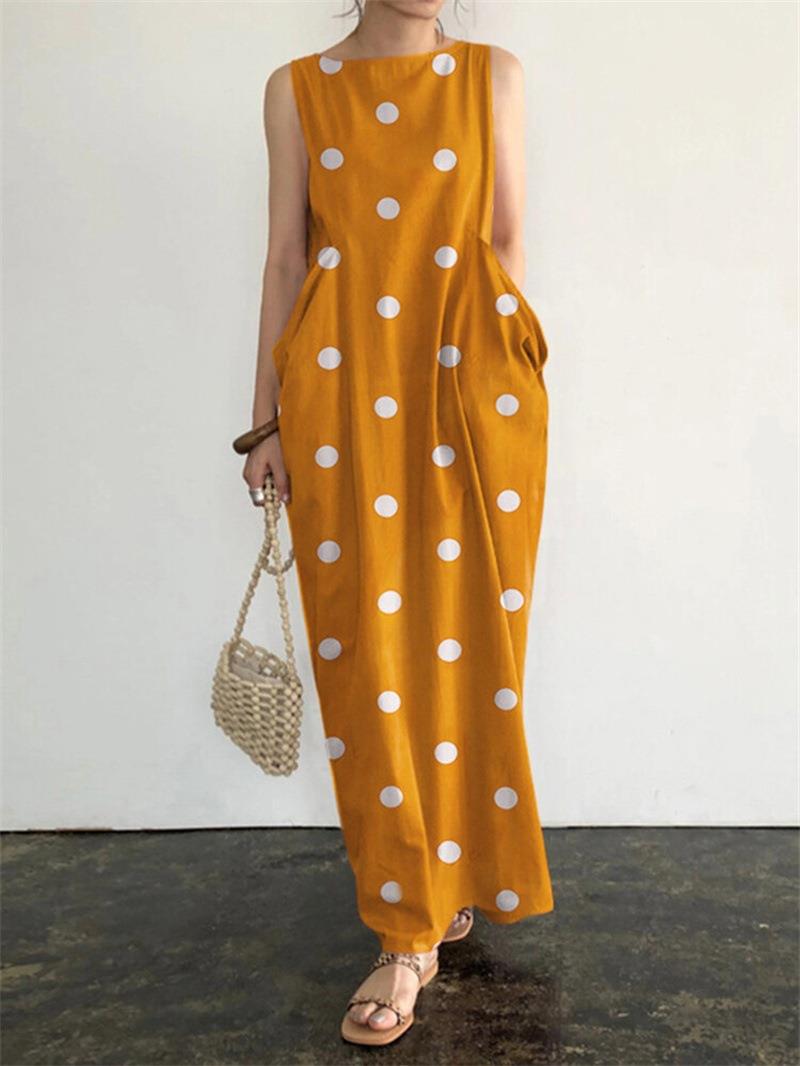 2023 Европейское и американское длинное платье в горошек с карманами - Повседневное с круглым вырезом 4XL