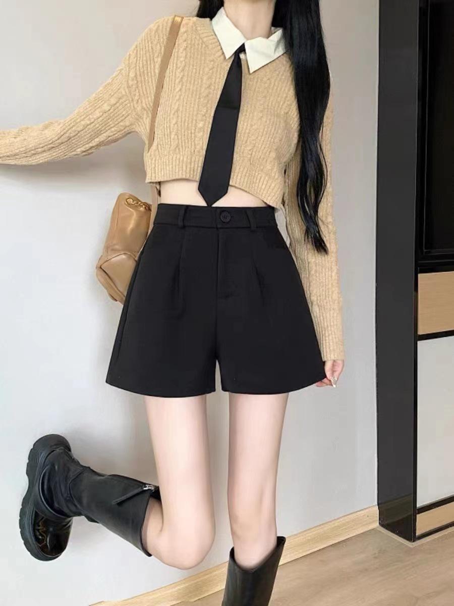 2023 Женские шерстяные шорты с высокой посадкой - Утягивающие, универсальные шорты с широкими штанинами для весны и осени M чёрный