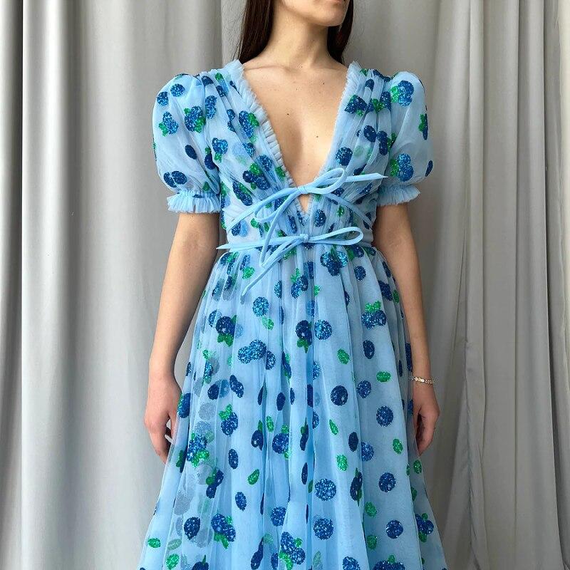2023 Женщины Вечеринка Длинное платье Короткий рукав V Шея Галстук Передняя высокая талия Фруктовые блестки Оборки Тюль Подол Принцесса Платье Y2k
