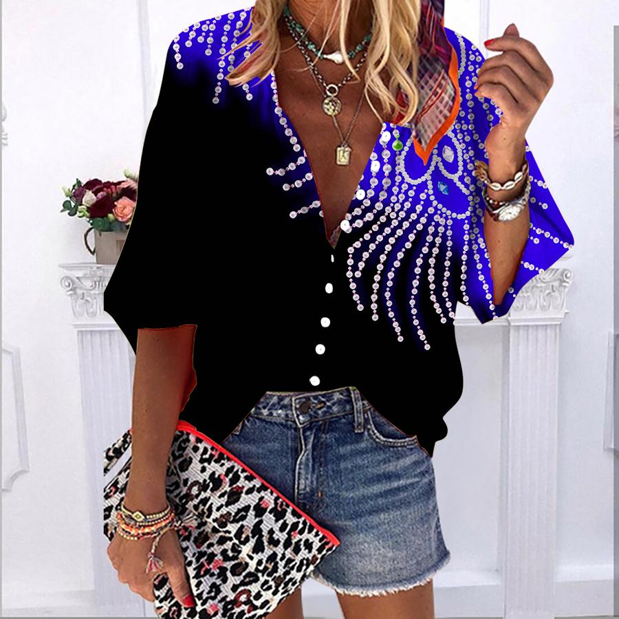 2023 Лето Осень Новая мода Женские топы Жемчужная кисточка с принтом Полурукав Повседневная рубашка больших размеров на пуговицах с пузырчатыми рукавами