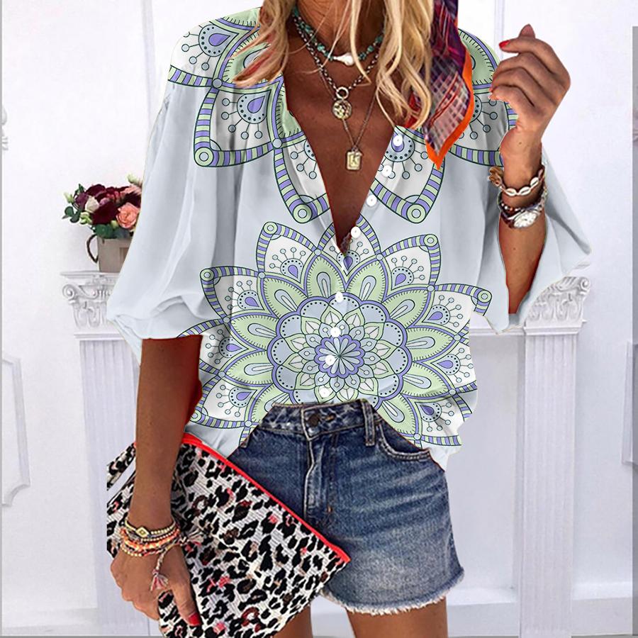 2023 Лето Осень Новая мода Женские топы Красивые Лотосовый принт Полурукав Повседневная рубашка больших размеров на пуговицах больших размеров с пузырьковыми рукавами