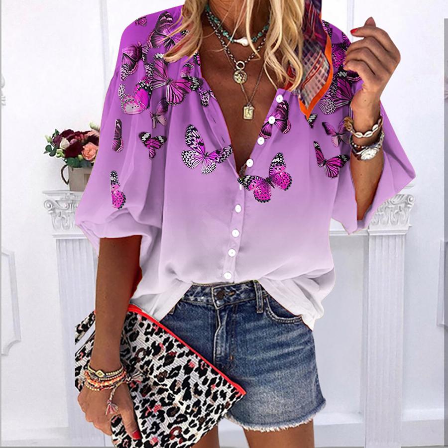 2023 Лето Осень Новая мода Женские топы Фиолетовая пятнистая бабочка с принтом Повседневная рубашка больших размеров на пуговицах с пузырьковыми рукавами
