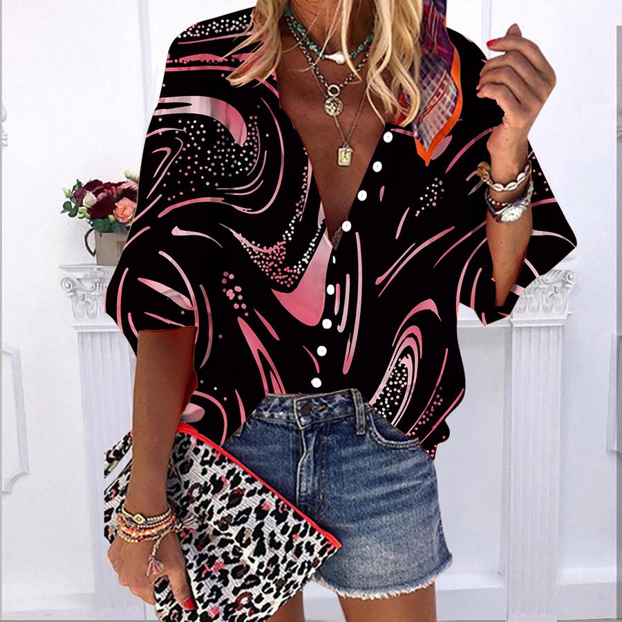 2023 Лето-Осень Новые модные женские топы Желтые звездные волны с принтом до половины рукава Повседневная рубашка на пуговицах больших размеров с объемными рукавами 3XL красный