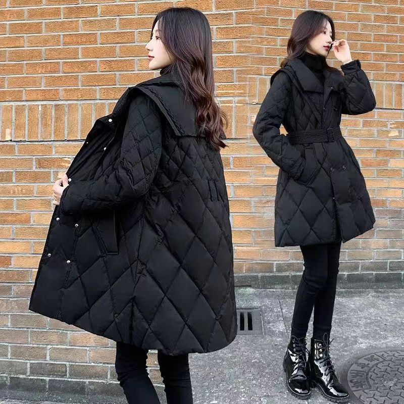 2023 Новое женское зимнее приталенное пальто средней длины с темно-синим воротником, черное тонкое пальто, утолщенное пальто XXL чёрный