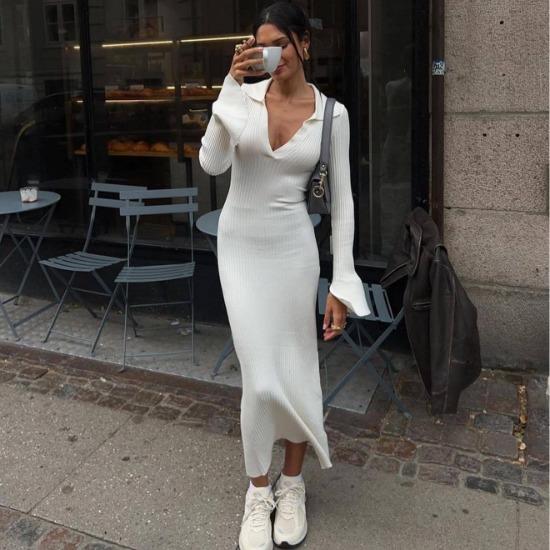 2023 Новое трикотажное однотонное длинное платье с длинными рукавами и глубоким V-образным вырезом в Европе и Америке, 2023 г.