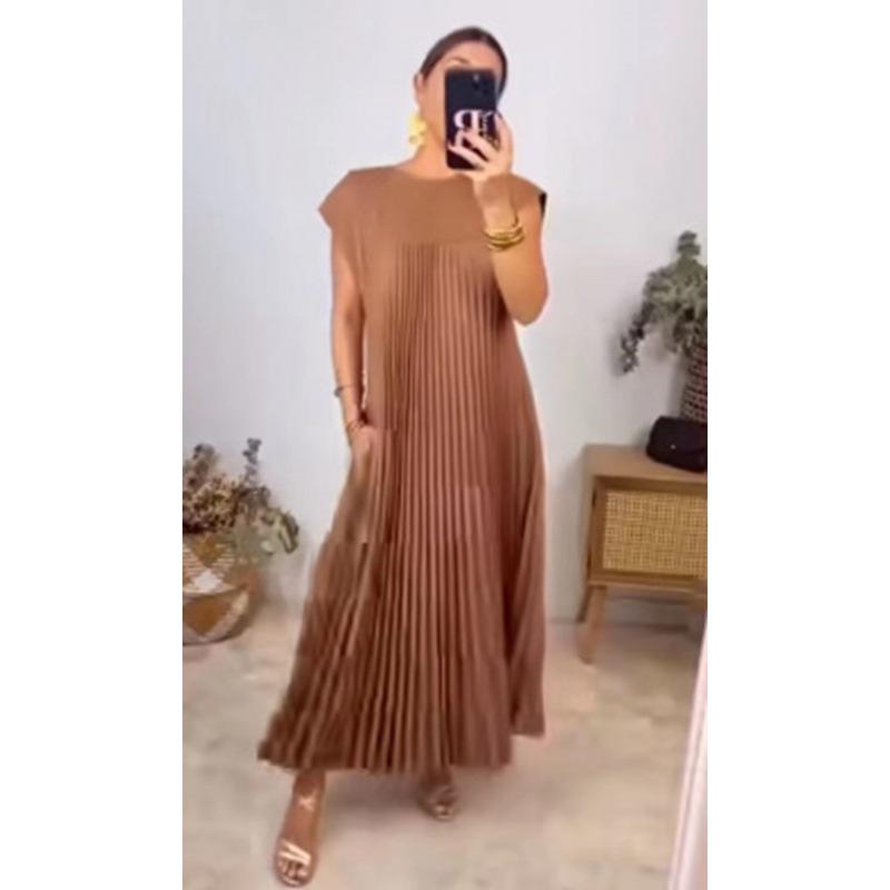 2023 Осень/Зима Европейская и Американская Мода Платье с Круглым Вырезом без Рукавов Плиссированное для Женщин XXL темно-коричневого