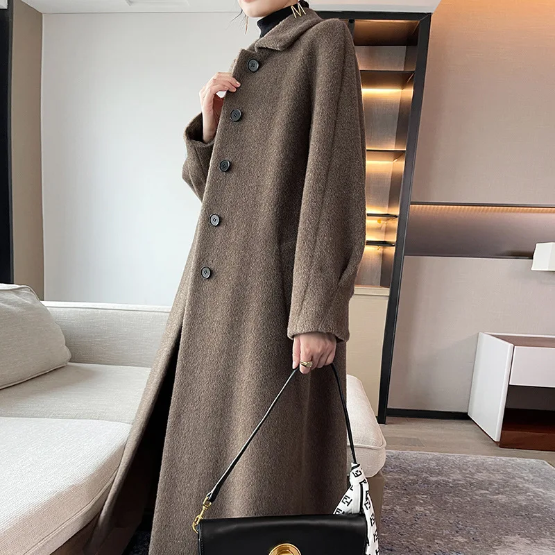 2023 высококачественное кашемировое пальто Vicuna, Женское зимнее длинное шерстяное черное пальто из альпаки, женское свободное повседневное модное приталенное пальто с лацканами, кофейного цвета