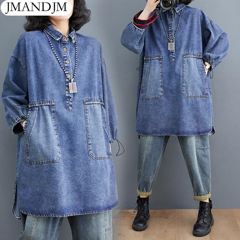 2023 женское осеннее платье, однотонное белое повседневное джинсовое базовое длинное платье, хлопковое винтажное пальто с лацканами, одежда больших размеров