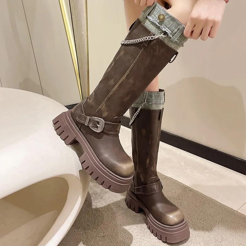 2024Платформа Пряжка на ремне Но Ботфорты до колена Женские Осенние Толстый каблук Вестерн Ковбой Рыцарь Ботас Пэчворк Универсальная Женская обувь 40 коричневый