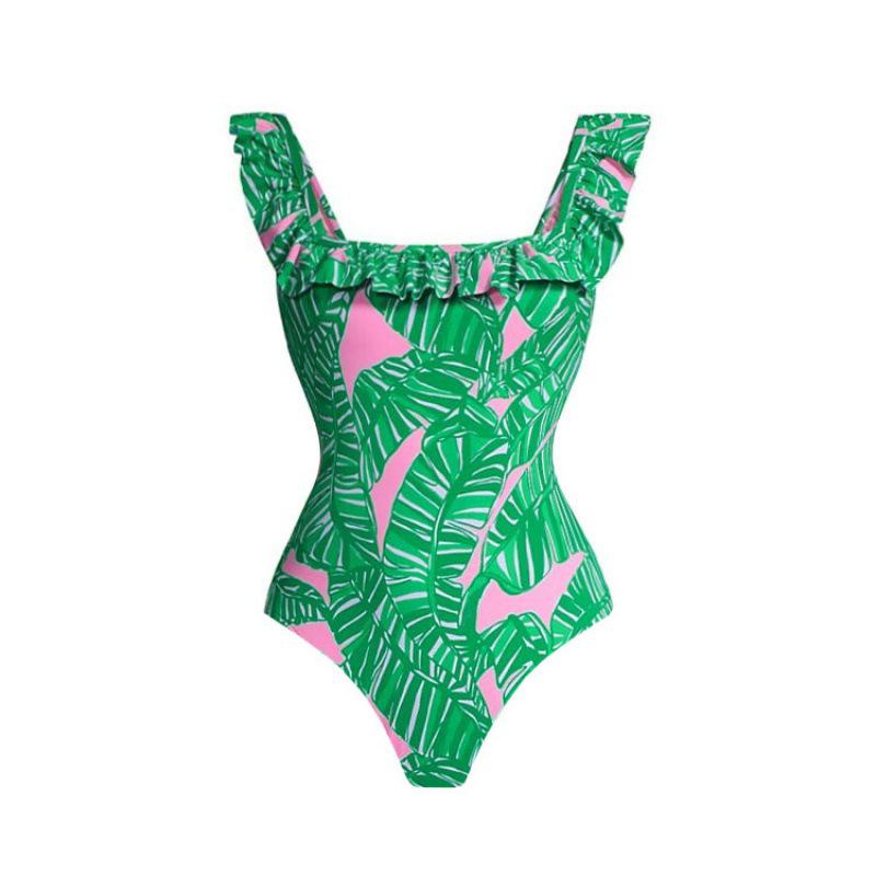 2024 Европейский и американский купальник с рюшами и зеленым принтом - Женский горячий стиль, стройнящий XL
