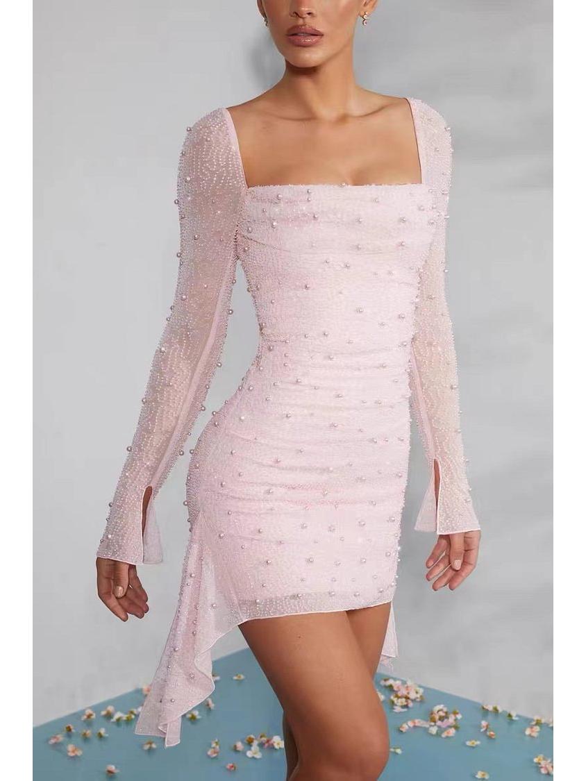 2024 Европейско-американская мода Весенне-летнее платье с длинными рукавами и отделкой бисером Medium розовый