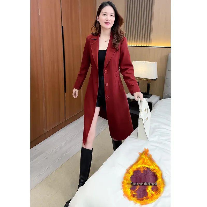 2024 Женское флисовое пальто-ветровка слим-фит - Зимнее теплое пальто средней длины с облегающей талией M бордовый