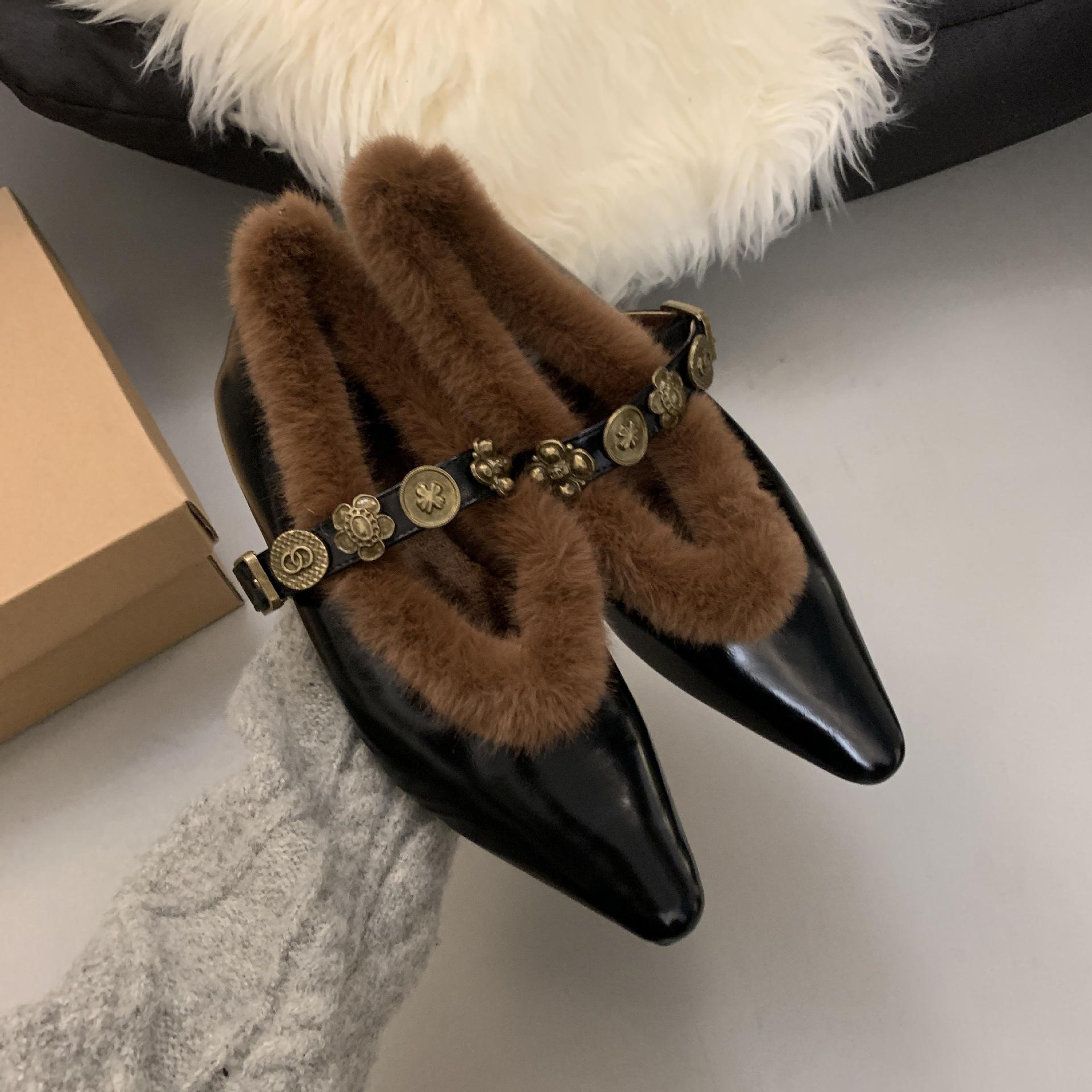 2024 Зима Новинка Женские Остроносые Туфли Лоферы на Толстом Каблуке с Заклепками Ретро Британский Стиль Теплые Повседневные Слипоны Массивная Обувь Женская Обувь 42