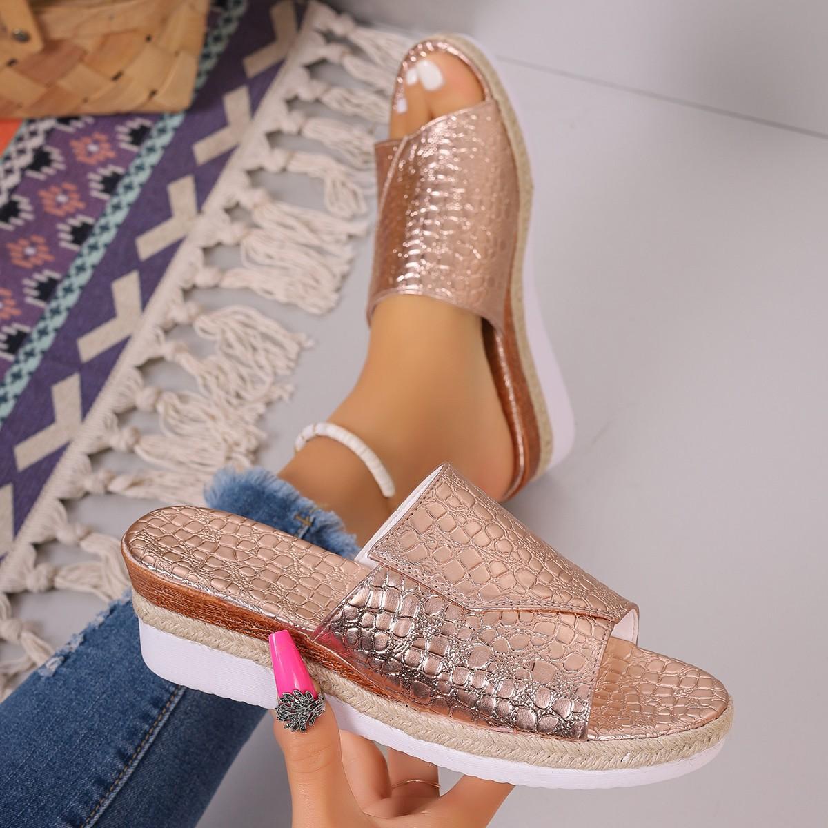 2024 Новые модные полосатые тапочки на платформе, женские летние блестящие босоножки на танкетке, женские нескользящие повседневные тапочки больших размеров 42 шампанского