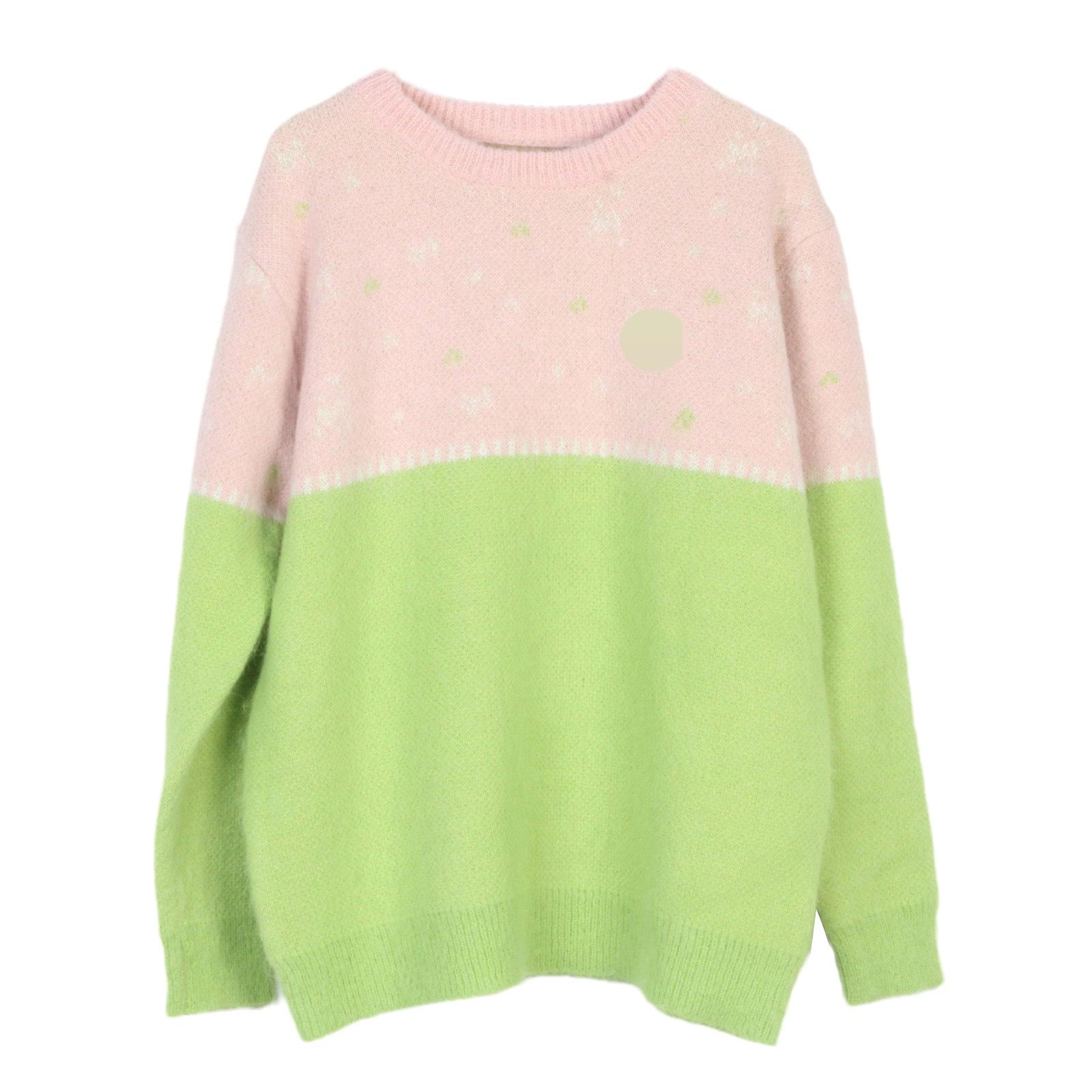 2024 Осень/Зима Жаккардовый Свитер с Круглым Вырезом в Розово-Зеленой Цветовой Блокировке - Милый, Молодежный и Универсальный S