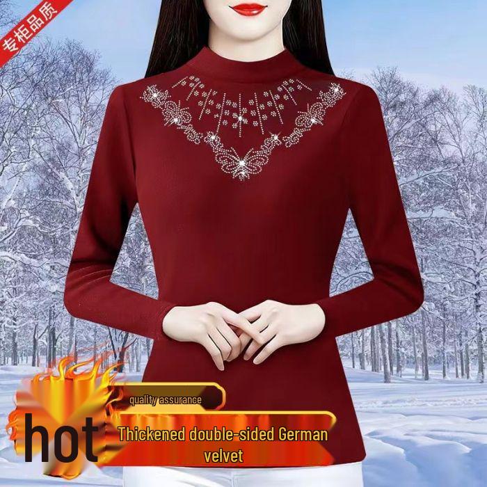 2024 Осень/Зима Женский Премиальный Топ Базового Слоя Облегающего Кроя Однотонный с Горячей Стразой 4XL