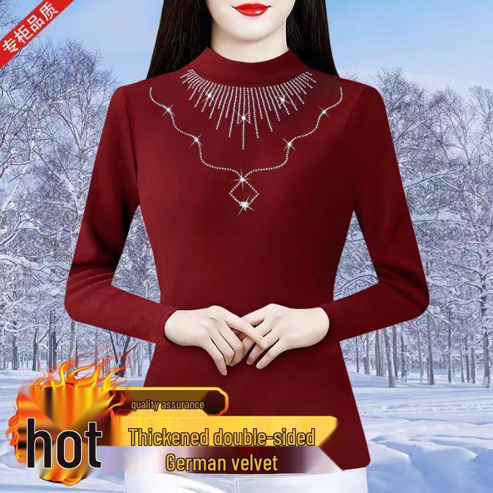 2024 Осень/Зима Женский Премиальный Топ Базового Слоя Облегающего Кроя Однотонный с Горячей Стразой 4XL