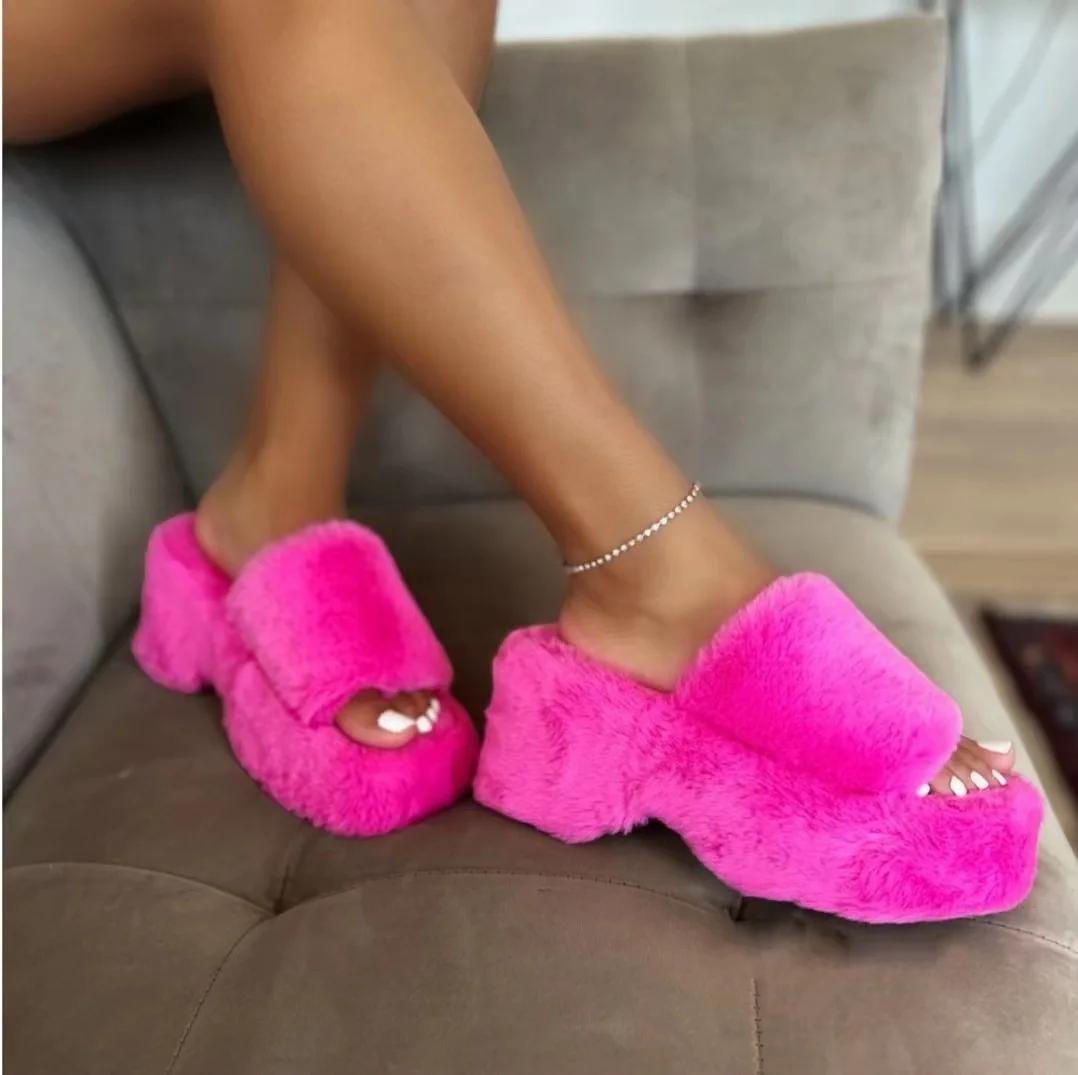 2024 Осень Зима Новые квадратные плюшевые танкетки Chinelos Feminino Большие размеры Теплые меховые туфли на платформе Нескользящие хлопковые тапочки 43
