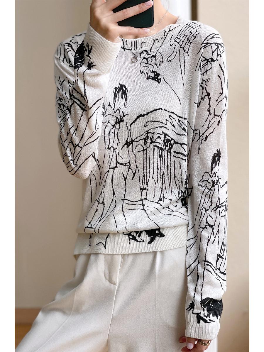 2024 Осень/Зима Черно-белый Граффити Круглый Вырез Длинный Рукав Вязаный Пуловер Топ XL белый