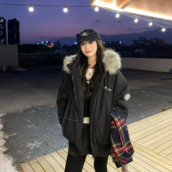 2024 Ретро Американская Хлопковая Куртка с Меховым Капюшоном - Высококачественное Крутое Дутое Пальто для Пар 2XL чёрный