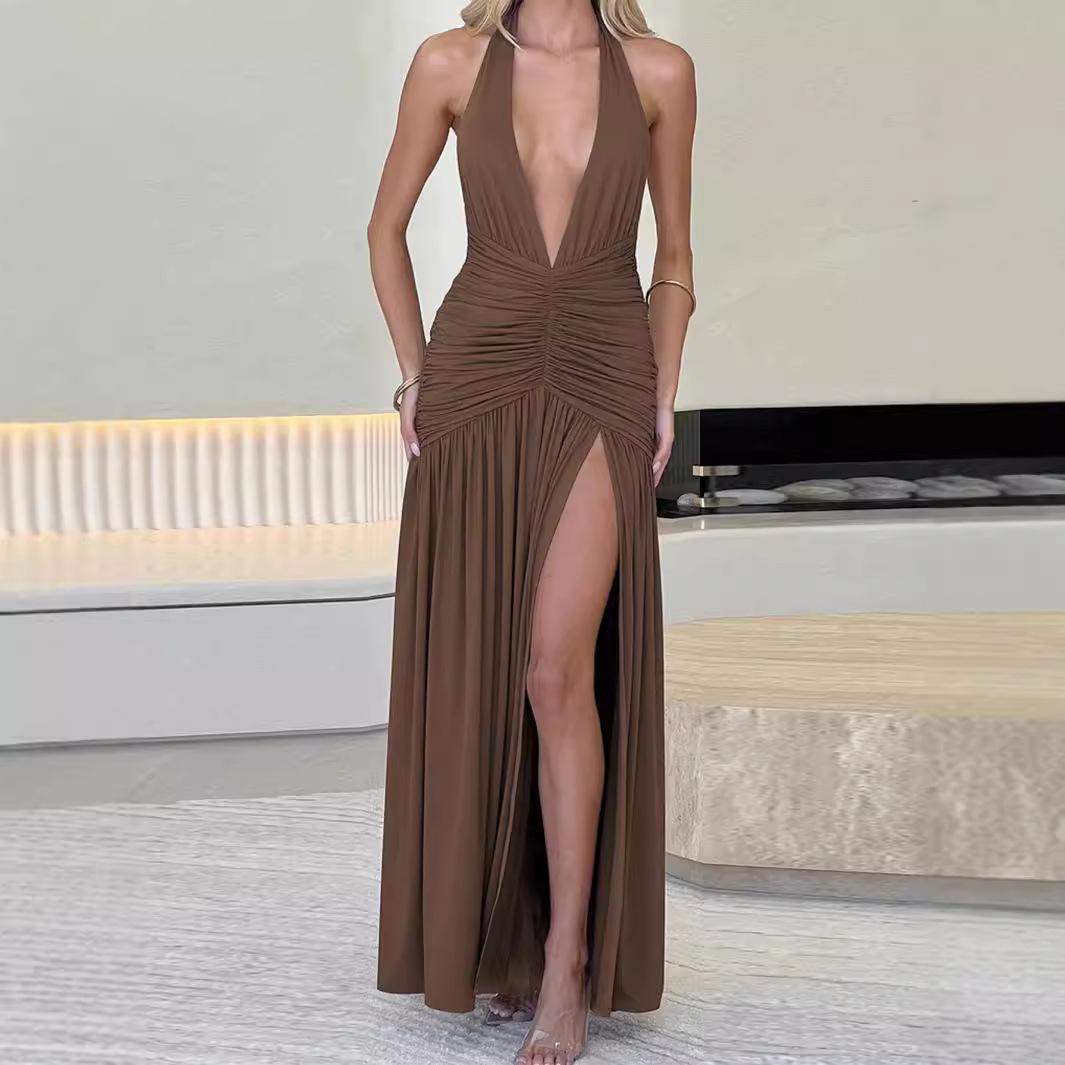 2024 Сексуальное платье макси с открытой спиной, V-образным вырезом, завязками и присборенным боковым разрезом Small легкие хаки