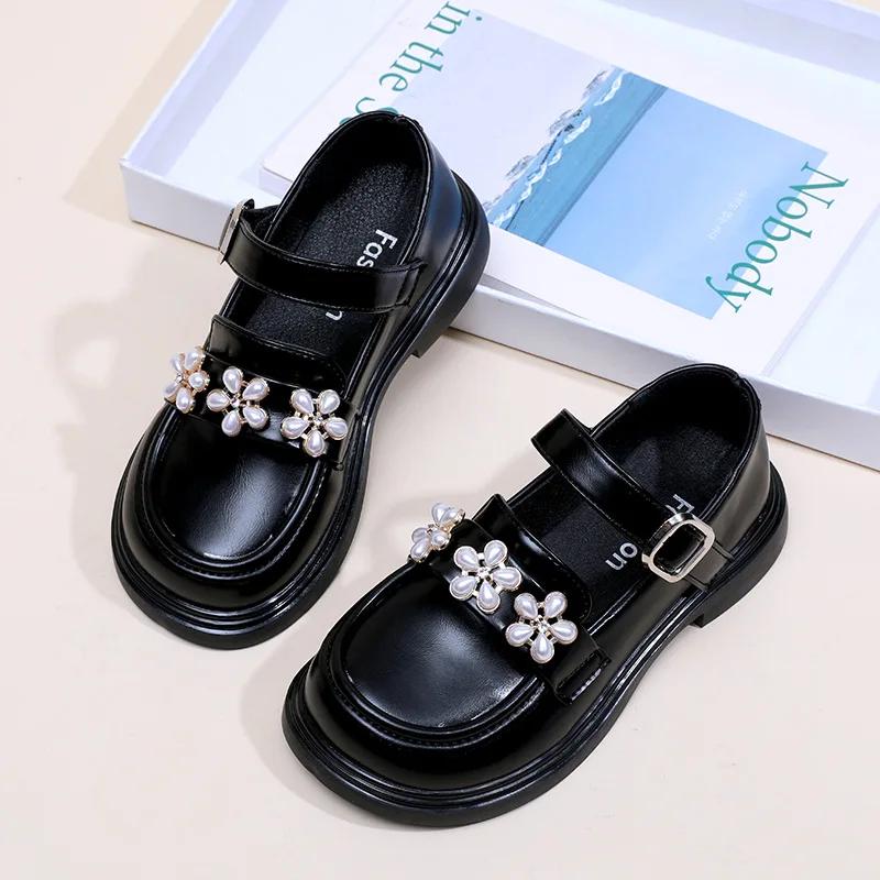 2024 Туфли принцессы из кожи для девочек, милые с цветами, детская школьная повседневная обувь, модные элегантные детские туфли Мэри Джейн на толстой подошве 26 чёрный