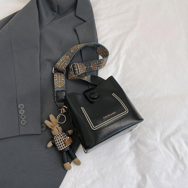 2024 весна новая мода повседневная сумка-ведро нишевая корейская версия ретро однотонная пригородная сумка-мессенджер с широким плечевым ремнем женская сумка Without pendant чёрный