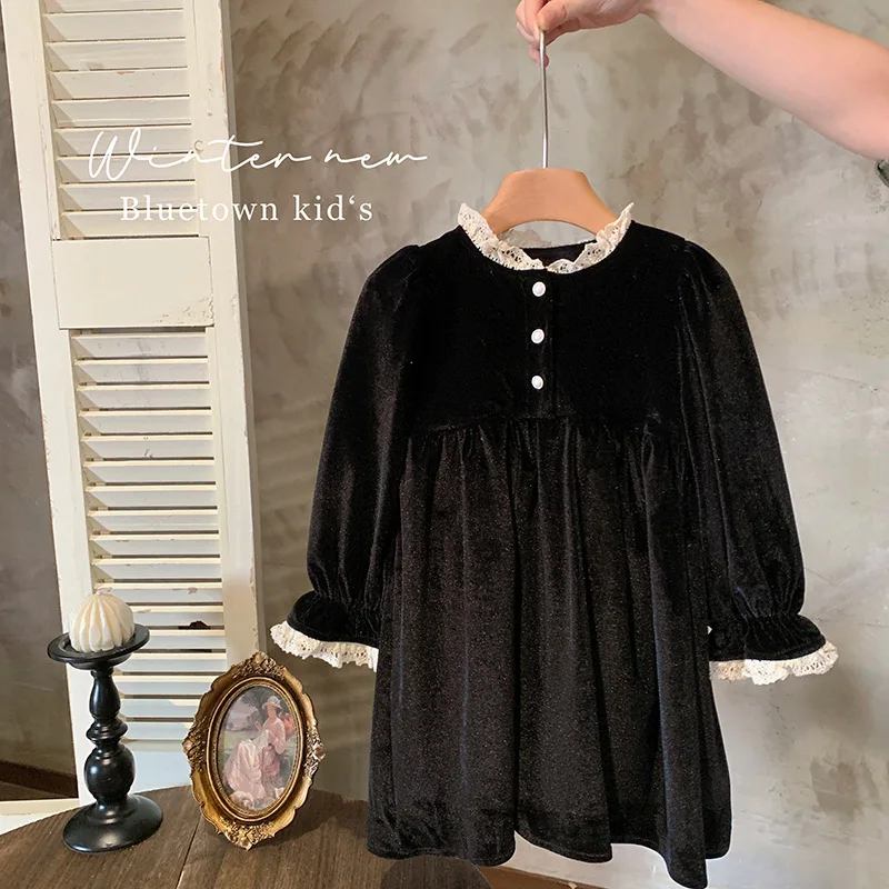 2024 винтажное платье для девочек, цельное платье для маленьких девочек на осень и зиму, детское бархатное кружевное платье с воротником, наряды для младенцев
