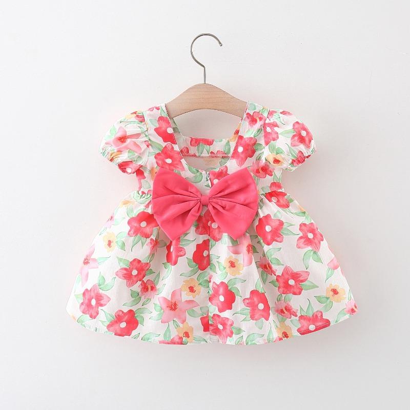 2024 летнее детское новое платье с короткими рукавами и бантом на спине для девочек, платье с цветочным рисунком, одежда для маленьких девочек 80cm розовый
