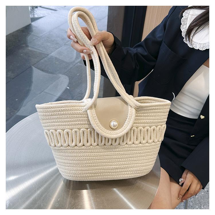 2024 новый чехол для сумки с жемчужной пряжкой, большая вместительная сумка-тоут для поездок на работу, хлопковая веревка, плетеная, портативная, полая, для овощей, сумка подмышкой белый