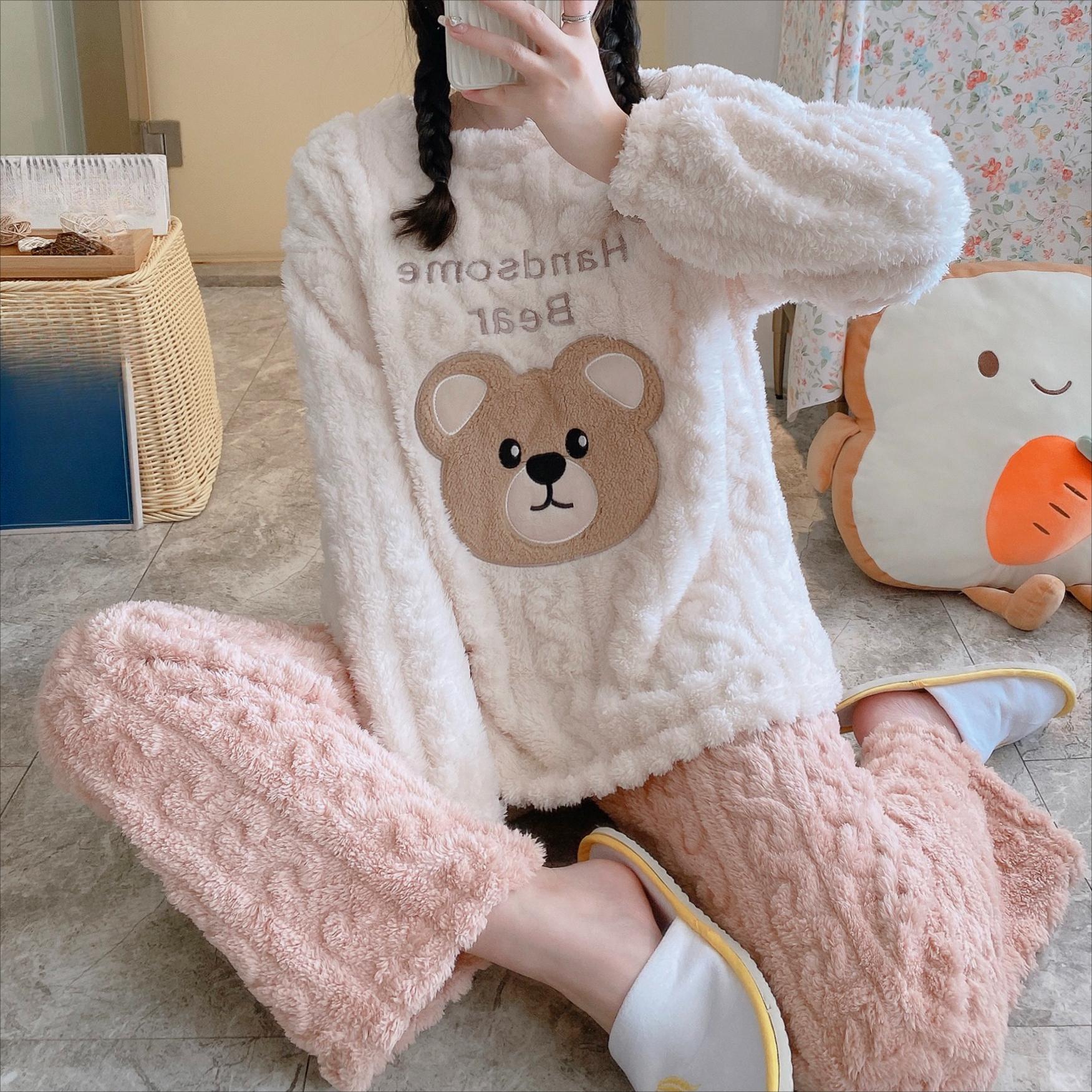 2024 осень зима Коралловый бархат пижамный комплект А-класса с длинным рукавом женские пижамы утолщенные пуловеры милый мультяшный медведь повседневная домашняя одежда костюм одежда для сна M