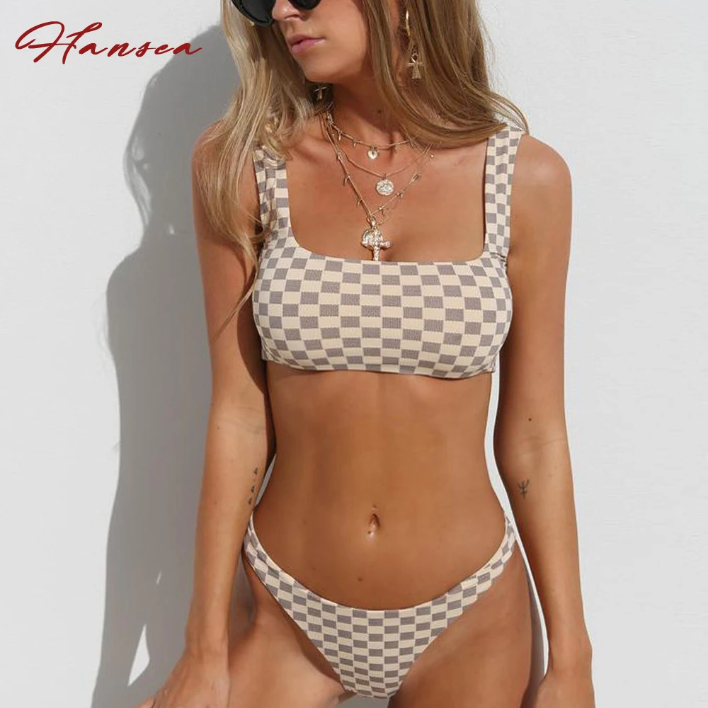 Square Neckline Tank Bikini Tankini High Cut Plaid Print Swimwear Low Wiasted Two Pieces Swimsuit Set Sexy Women Bathing Suit