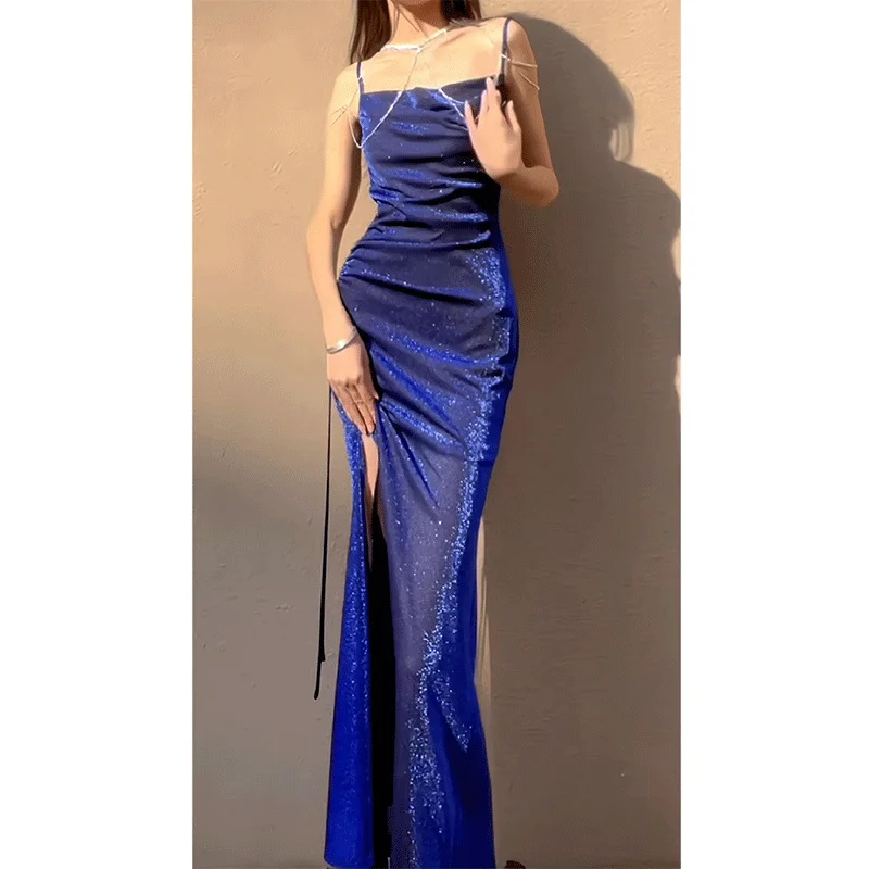 2024 синее блестящее шелковое вязаное платье, соблазнительное вечернее платье, синее шелковое платье-годе, вечерние платья для вечеринки, дня рождения