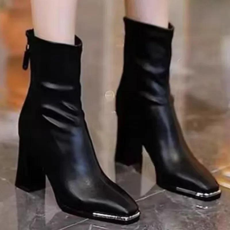2025Женские ботильоны Мода Задние молнии Обувь Винтажные квадратные каблуки Осень Зима Женские эластичные Современные ботильоны 35-40 38 чёрный