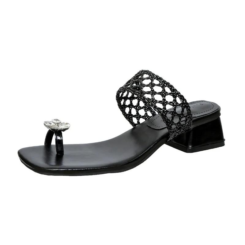2025 Горячая Распродажа Летние Босоножки Тонг с Квадратным Носком и Средним Каблуком, Ажурное Плетение, Стразы, Нарядные, Для Улицы, Женские Классические Шлепанцы 40 чёрный