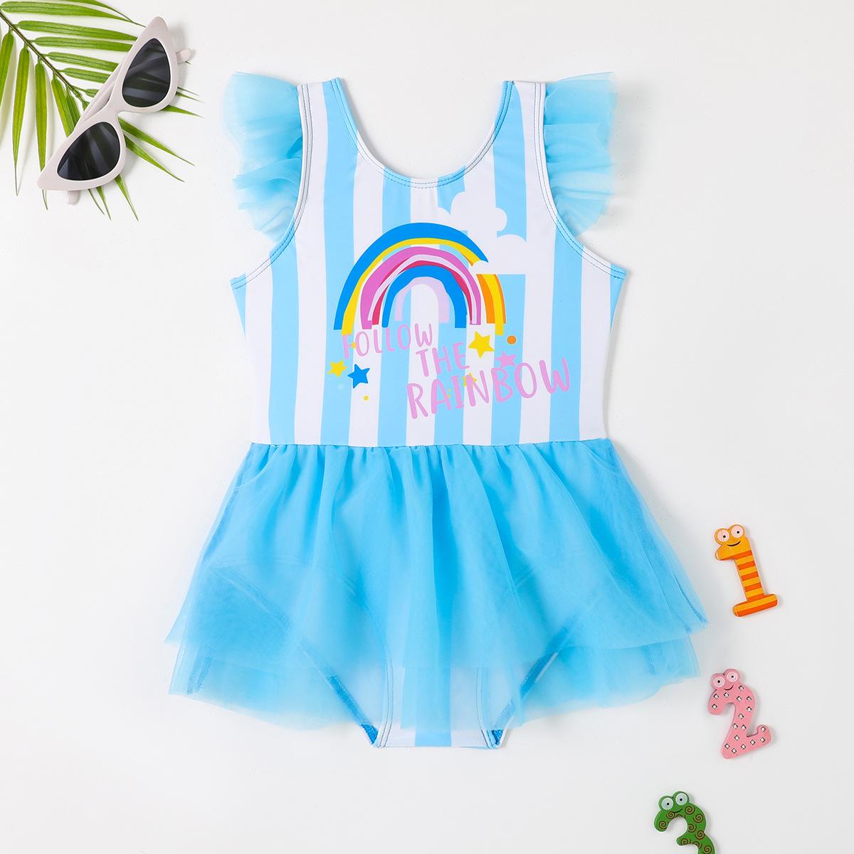 2025 Девочки Радужный Полосатый Слитный Купальник с Юбкой из Тюля 5 Years синий