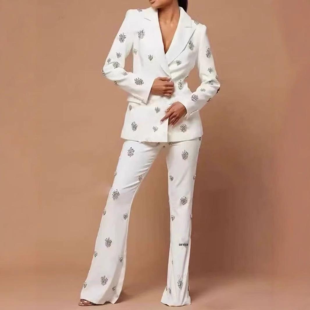 2025 Европейская и американская мода Бисер Стразы Костюм Пиджак и Брюки Клеш Medium белый