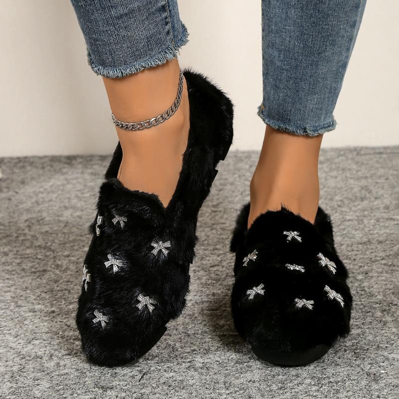 2025 Модные Горячие Продажи Простые Хрустальные Цветы Меховые Балетки Женские Ремешок на Щиколотке Меховые Стразы Снежинки Мех Зимняя Обувь 42 чёрный