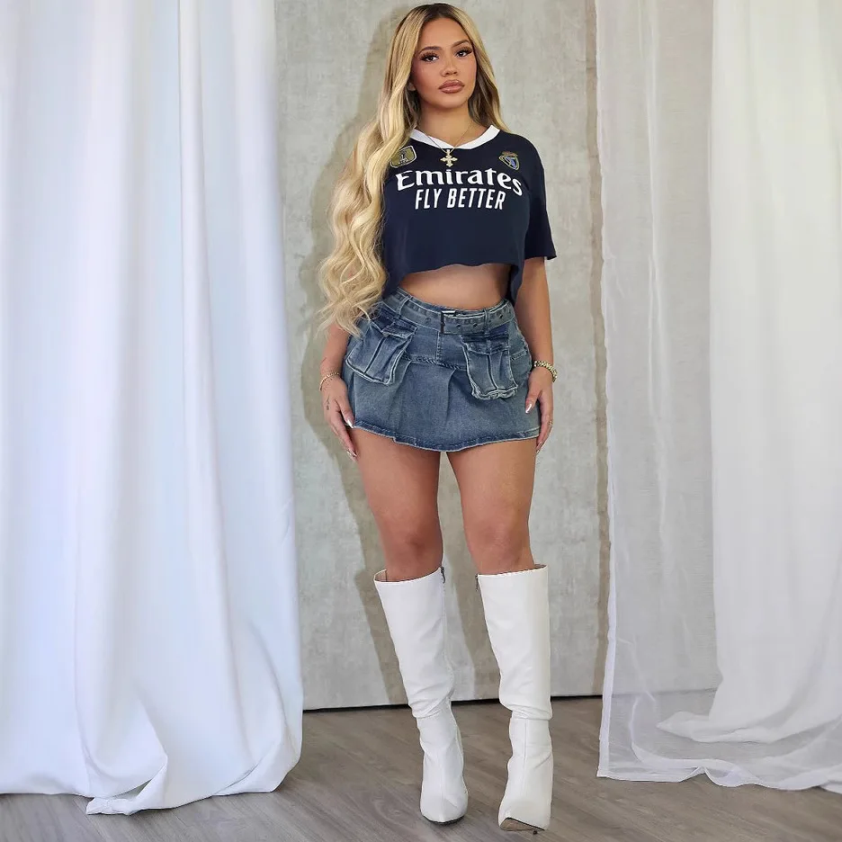 2025 Новая облегающая плиссированная джинсовая юбка с высокой талией и несколькими карманами и рюшами по подолу, женская синяя модная модная короткая юбка
