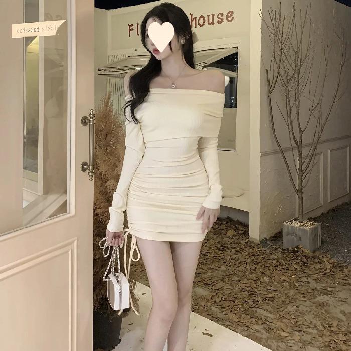 2025 Новое осенне-зимнее абрикосовое облегающее платье на одно плечо - длинный рукав, сексуальное, облегающая юбка One Size абрикосовый