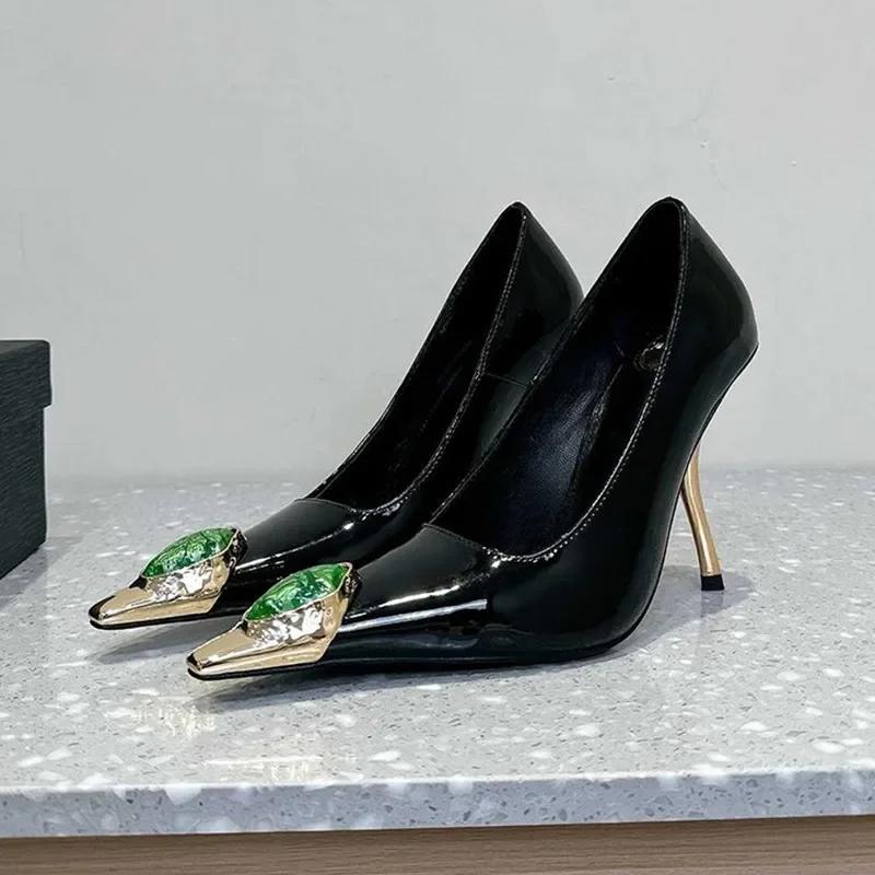 2025 Новые Роскошные Туфли-лодочки из лакированной кожи с драгоценными камнями и металлическим квадратным носком, Женская Модная Офисная Обувь на Тонком Высоком Каблуке для Вечеринок и Банкетов 35 чёрный