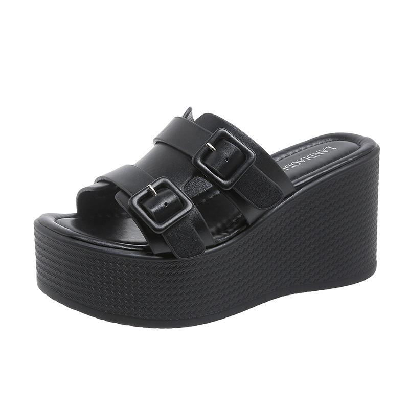 2025 Новые уличные сандалии на толстой подошве, женские тапочки на танкетке с круглым носком, однотонные, с двойной пряжкой, большие размеры, пляжные шлепанцы 35 чёрный