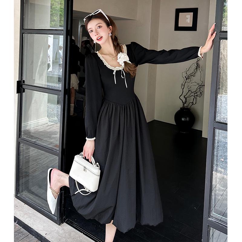 2025 Осень/Зима Черное Кружево Круглый Вырез Милая Девушка Тонкий Длинное Платье One Size чёрный
