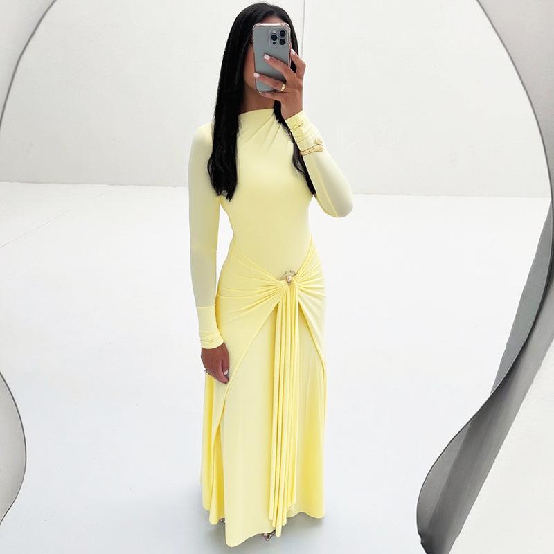 2025 Осень Элегантное женское однотонное платье с длинным рукавом и декоративной завязкой с кольцом-пряжкой S жёлтый
