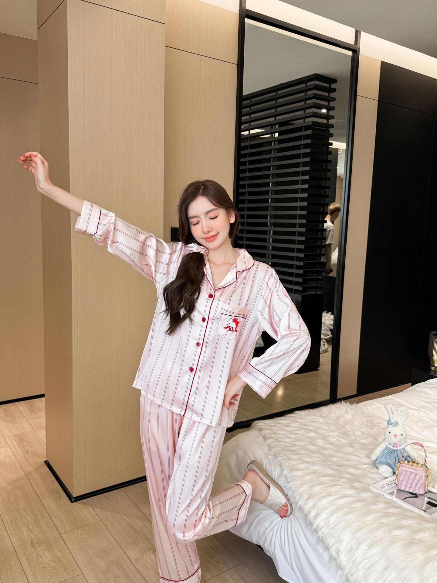 2025 Полосатый Милый Кот Ледяной Шелк Женская Домашняя Одежда - Сладкий и Прелестный Девичий Стиль для Весны/Осени L