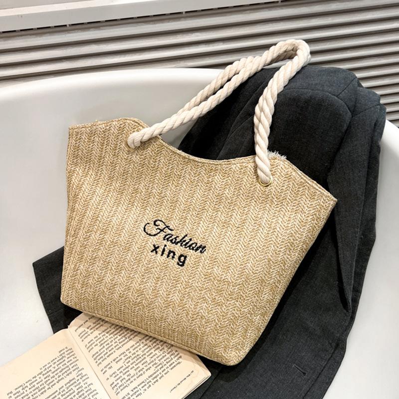 2025 Портативная соломенная сумка-тоут Новая летняя плетеная сумка через плечо Простая сумка-ведро Повседневная женская сумка большой вместимости хаки
